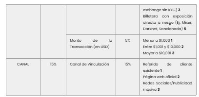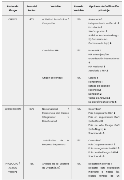 - Ejemplo práctico: Se identifica un riesgo alto cuando un cliente nuevo desde una jurisdicción no cooperante (según GAFI) solicita enviar 25,000 USDT sin una justificación económica clara de su actividad.